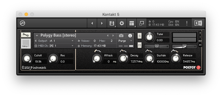 Polygy Bass comes with four different sample sets: rich bass, soft bass, power bass and pulse bass. A total of 25 presets varied in +4, +5, octave, mono, stereo and unison. The modulation wheel functions as a secondary lowpass filter (additional to the built in filter). With the built in envelope you can alter ADSR and filter cutoff/resonance.
