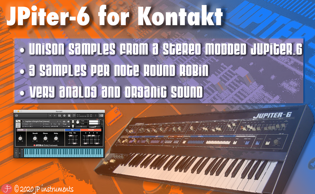 The JPiter-6 is a Kontakt sample player of the Roland Jupiter-6 that can be used in almost any daw. All keys were sampled in three layers round robin which are carefully looped.